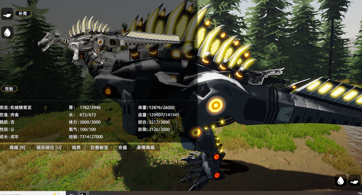 在游戏中,机械脊背龙是由小脊背龙慢慢成长,加上机械材料进化而来的,它是食肉恐龙,血量为4万1,伤害为1950,具有超大挂流血功能,无最高会员会流血死亡